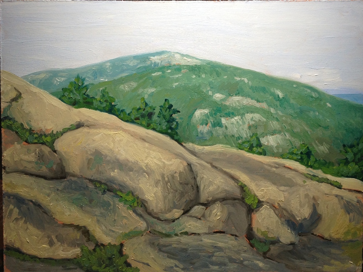 CadillacFromPimetic Published 10/26/2012 at 1265 × 949 in Finished, Fixed (maybe?), and New Looking from Pimetic Mt. to Cadillac Mt. Oil on board. 9″x12″ Painted from a photograph
