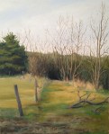 “Echoes” is an exploration of the psychological and physical landscape of my childhood. Growing up in rural New Hampshire fostered a sense of exploration, but also a sense of isolation within a foreboding landscape. The paintings are not slavish depictions of sites, they are a mixture of observation and memory. In the works I portray the unequal balance between the person and nature. The presence of human activity is often secondary – pushed to the edges, or on the verge of succumbing to nature.