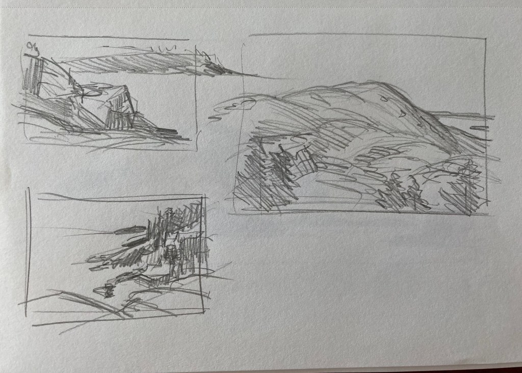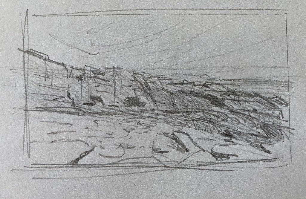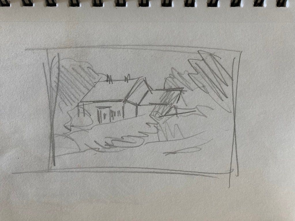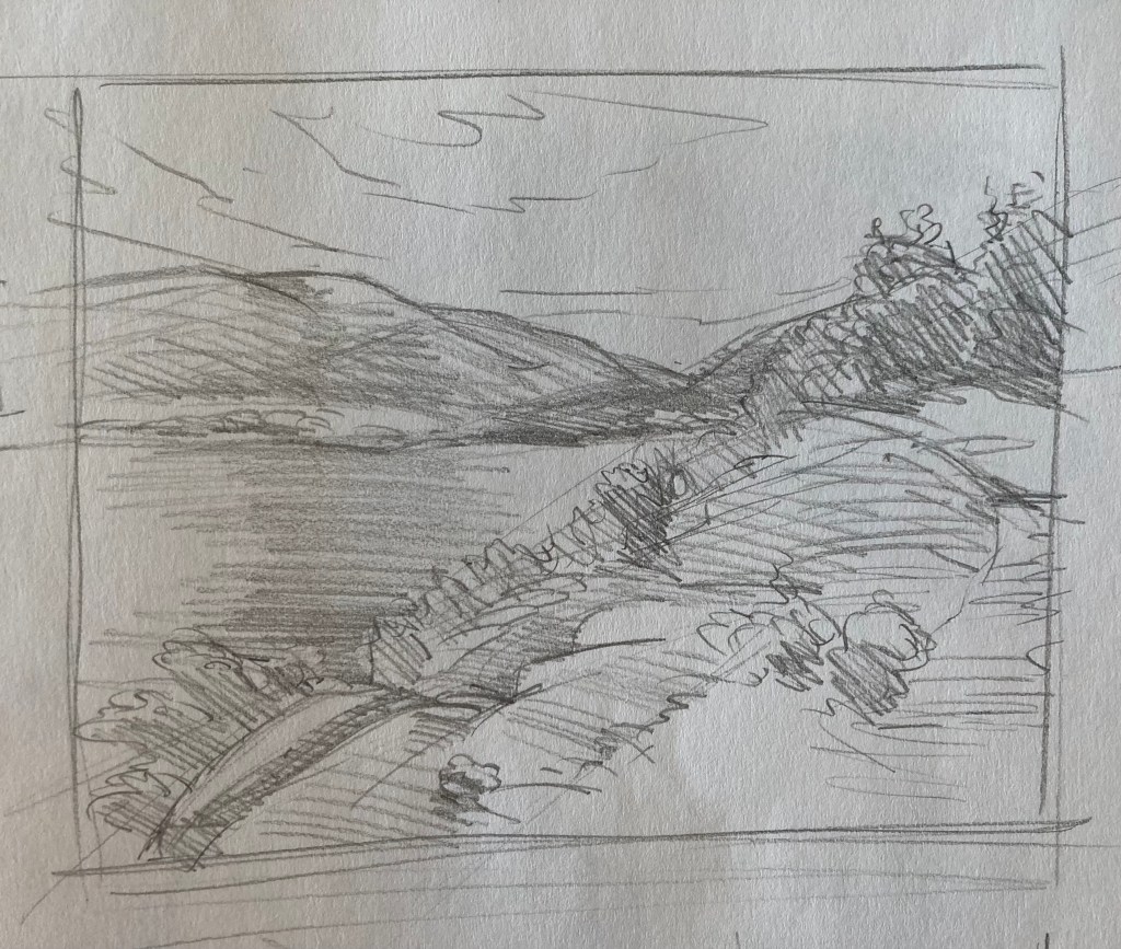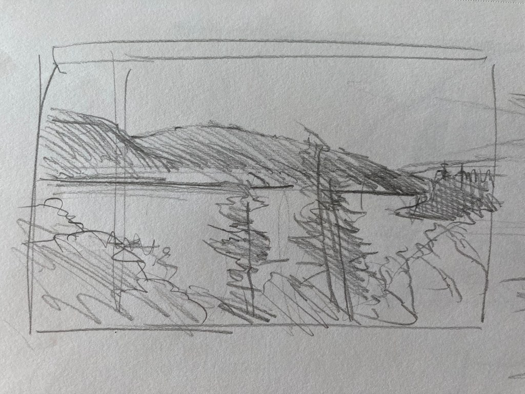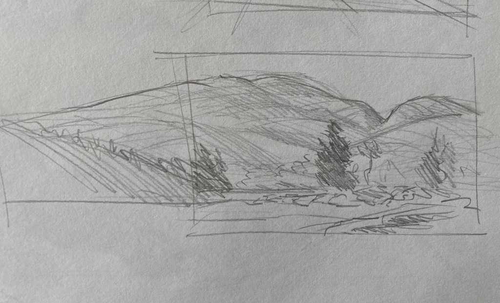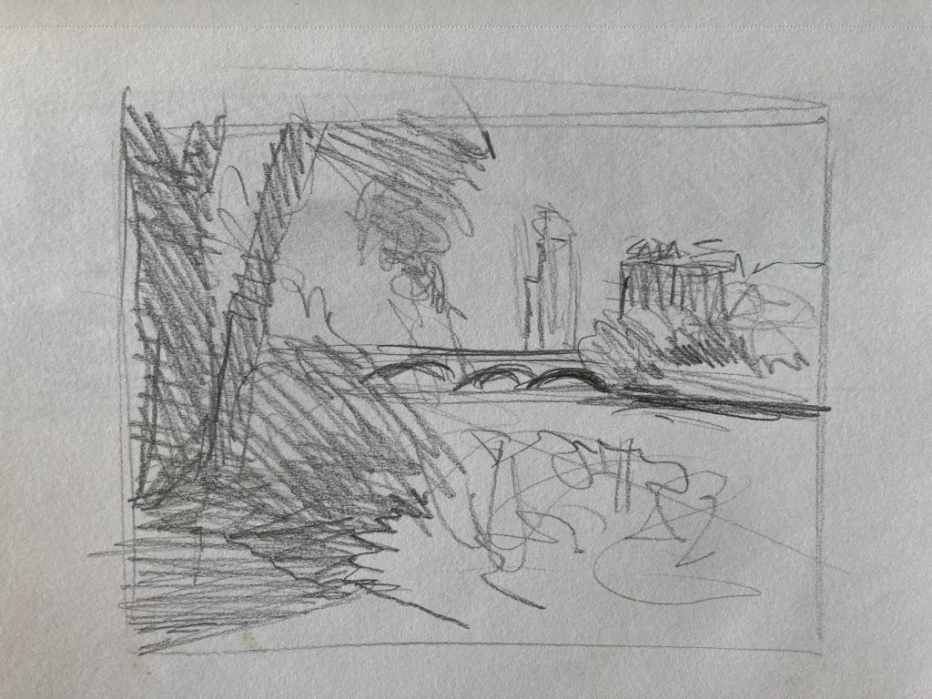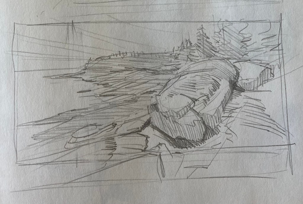 Generally, until now, I have treated drawing as a practical matter – something needed to roughly establish a composition before painting. As such, I don’t have a lot of drawings to show you. Below is a sampling of what I’ve done from life. Most are compositional drawings done for plein-air paintings, although I have begun to carry a sketchbook with me and draw at leisure.