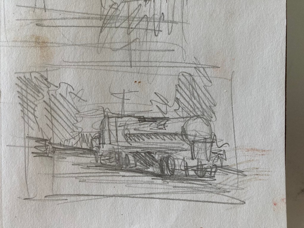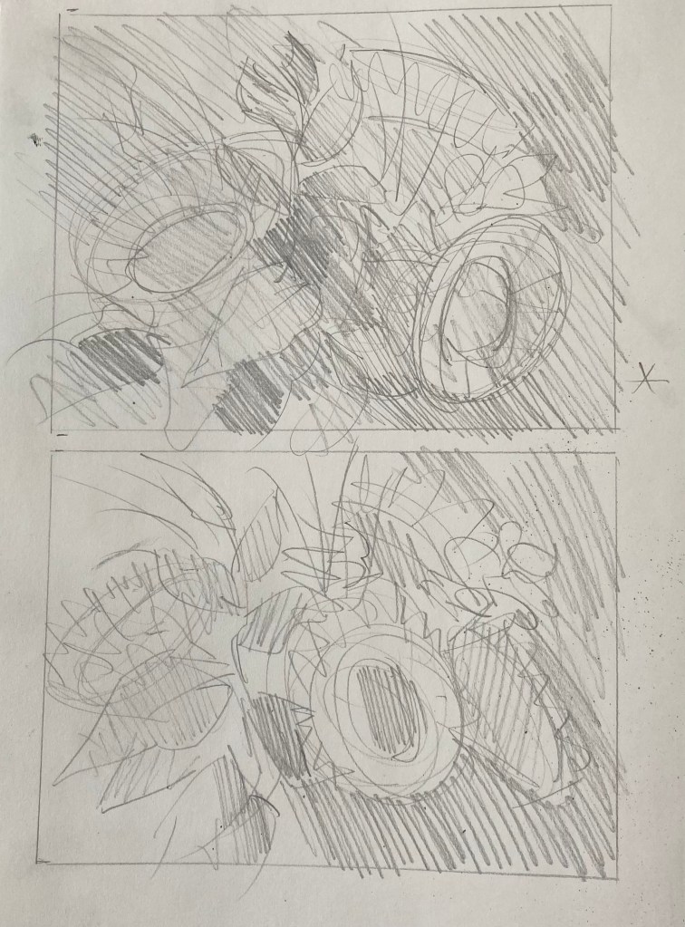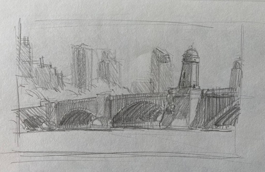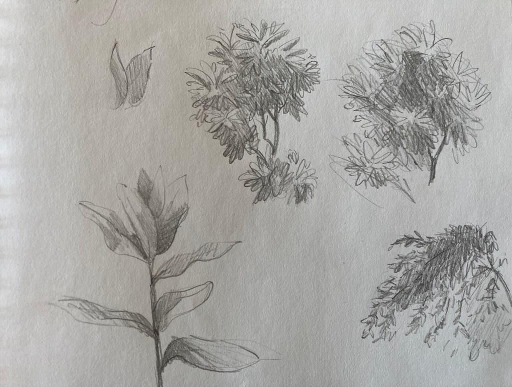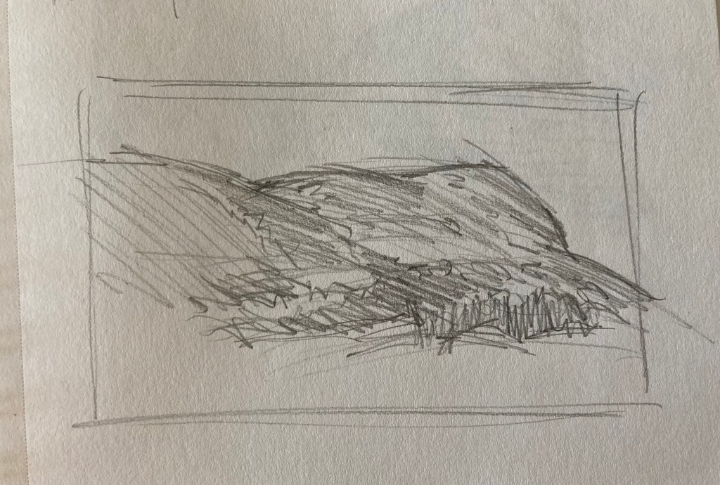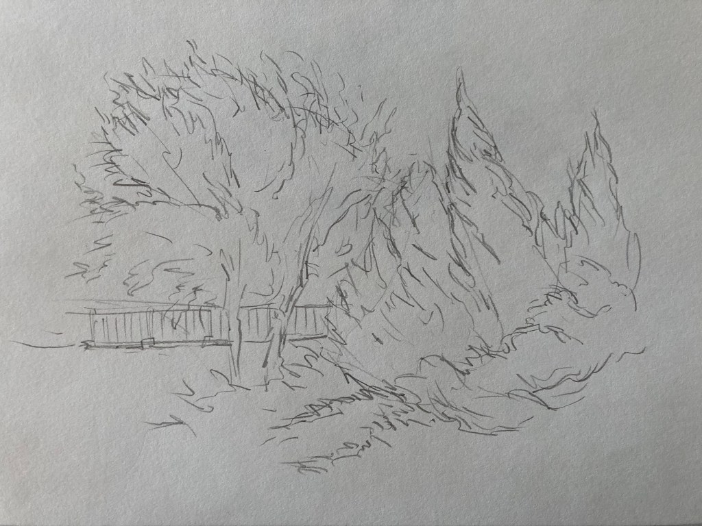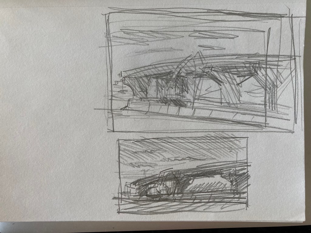 Generally, until now, I have treated drawing as a practical matter – something needed to roughly establish a composition before painting. As such, I don’t have a lot of drawings to show you. Below is a sampling of what I’ve done from life. Most are compositional drawings done for plein-air paintings, although I have begun to carry a sketchbook with me and draw at leisure.