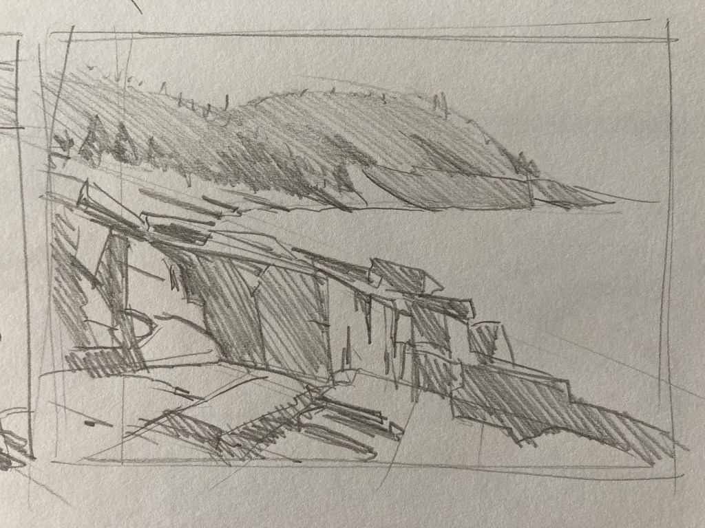 I’ve also taken to drawing from Street-View on my lunch breaks. I know it’s a bit of a handicap to have a still image that already has a frame around it. It has allowed me to think more about rhythm and shapes. Especially drawing areas such as Acadia, which have such a unique shape language in the rocks, trees, and mountains. I’ll be in Acadia in person next week, and will be drawing from life while I’m there.