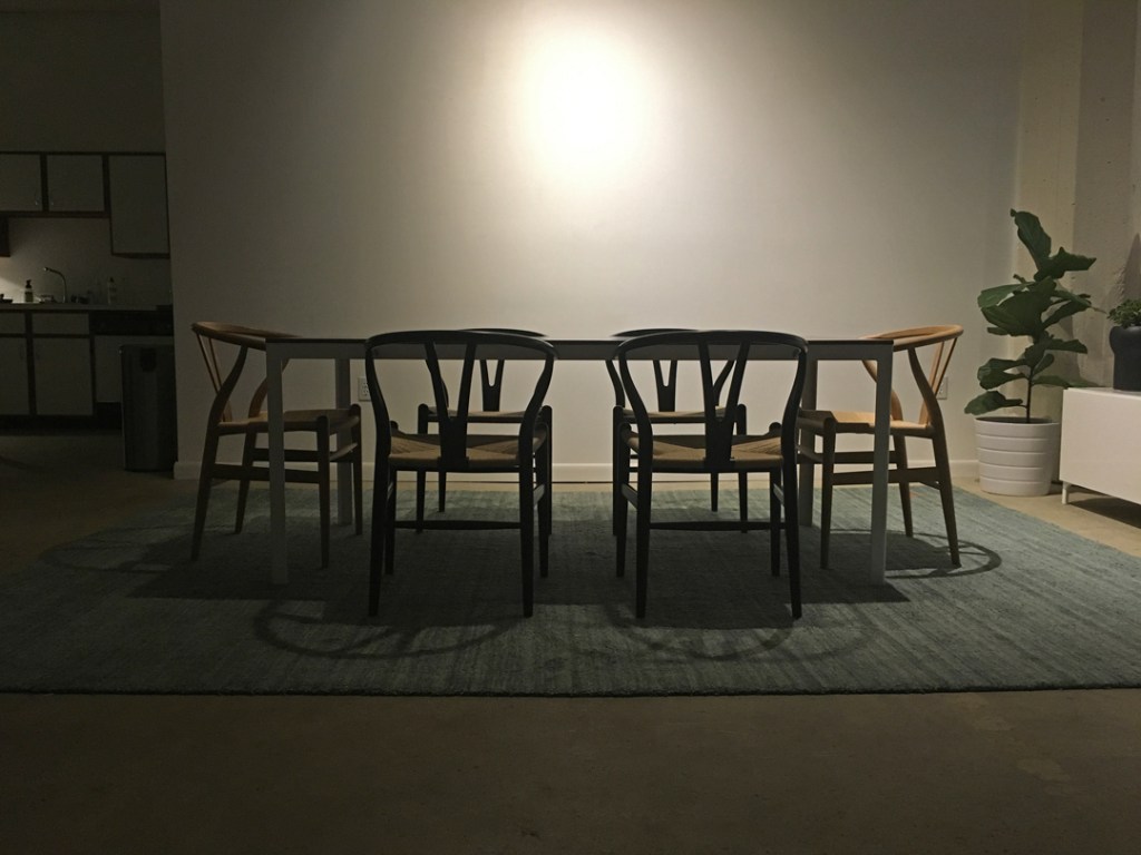 At night the dining table is silhouetted against the white wall. The table top gets pretty dramatic when the spotlight hits the walnut.