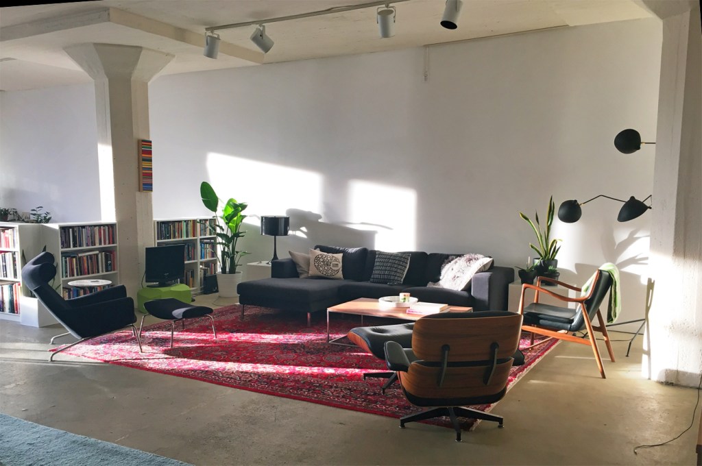 The front room is still a workspace/studio/lounge. The natural light is great for painting.